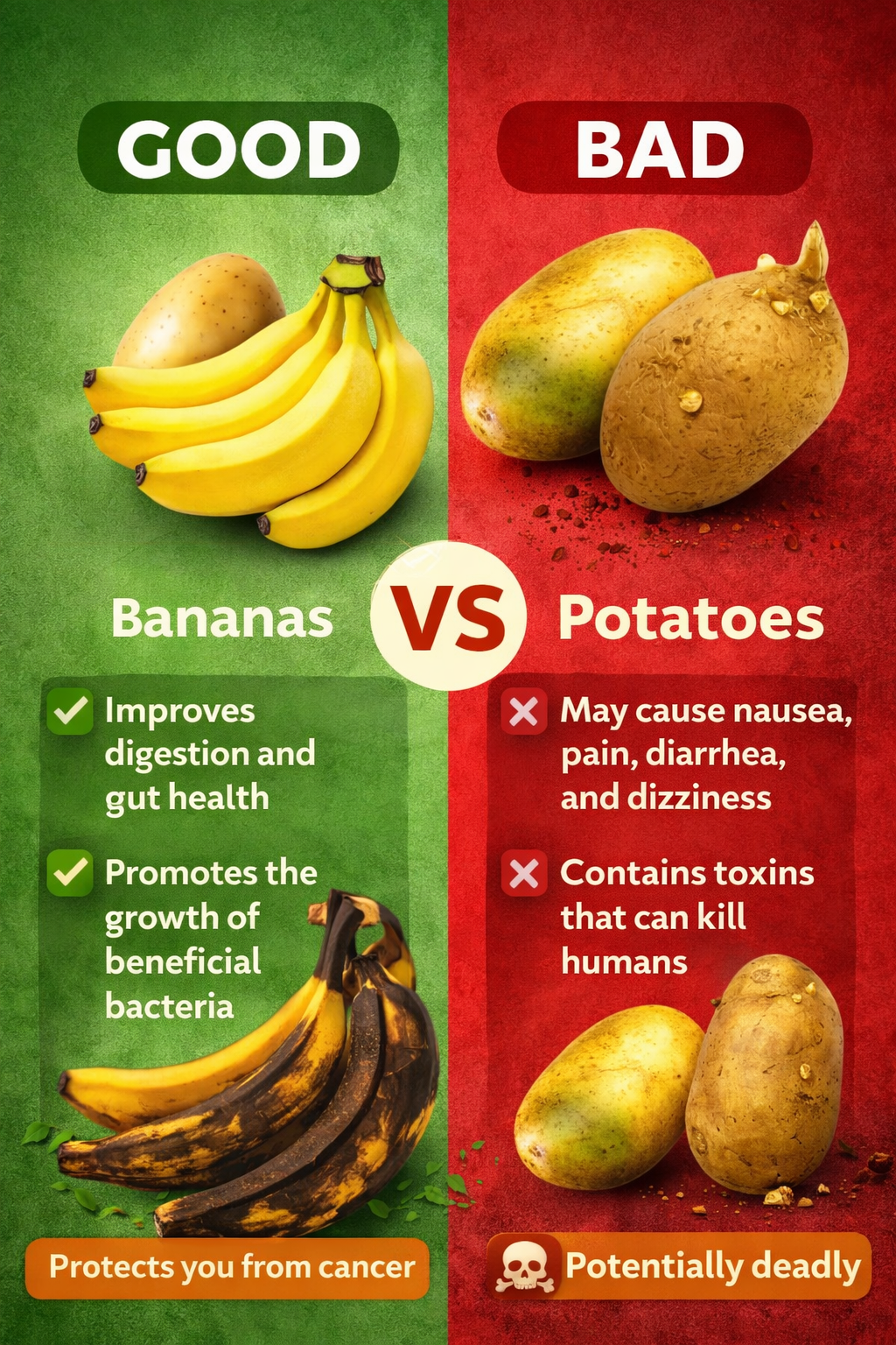 Potatoes and bananas are two of the most widely consumed foods around the world. Affordable, versatile, and nutrient-rich, they appear in many everyday meals across the United States, United Kingdom, and Canada. While both foods offer impressive health benefits, they also come with a few potential risks when eaten in excess or prepared improperly. Understanding their nutritional value can help you enjoy them as part of a balanced, healthy diet.🥔 Health Benefits of Potatoes1. Rich Source of Essential NutrientsPotatoes are packed with important vitamins and minerals. They are an excellent source of vitamin C, vitamin B6, potassium, and magnesium. Potassium supports heart health and helps regulate blood pressure, making potatoes particularly beneficial when eaten in their whole, unprocessed form.2. Supports Digestive HealthPotatoes contain dietary fiber, especially when eaten with the skin on. Fiber aids digestion, supports gut health, and helps prevent constipation. Cooked and cooled potatoes also contain resistant starch, which acts as a prebiotic and feeds beneficial gut bacteria.3. Provides Sustainable EnergyAs a carbohydrate-rich food, potatoes are a great source of long-lasting energy. This makes them ideal for athletes, active individuals, and anyone needing fuel for physical or mental performance.4. Naturally Fat-Free and Gluten-FreePlain potatoes are naturally low in fat and free from gluten, making them suitable for people with gluten intolerance or celiac disease.⚠️ Potential Health Risks of Potatoes1. High Glycemic IndexPotatoes can raise blood sugar levels quickly, especially when fried or mashed. This may be a concern for individuals with diabetes or insulin resistance.2. Unhealthy Cooking MethodsFrench fries, chips, and heavily buttered potatoes add excess calories, sodium, and unhealthy fats. These preparations can increase the risk of weight gain and heart disease.3. Green or Sprouted PotatoesPotatoes that turn green or sprout contain solanine, a natural toxin that can cause nausea, headaches, and digestive issues if consumed in large amounts.🍌 Health Benefits of Bananas1. Excellent Source of PotassiumBananas are well known for their high potassium content, which supports heart health, muscle function, and blood pressure regulation.2. Boosts Digestive HealthBananas contain soluble fiber, particularly pectin, which supports digestion and helps regulate bowel movements. They are gentle on the stomach and often recommended for digestive discomfort.3. Natural Energy BoosterThe natural sugars in bananas—glucose, fructose, and sucrose—provide a quick and healthy energy boost. This makes bananas a popular pre- or post-workout snack.4. Supports Mood and Brain HealthBananas contain vitamin B6, which helps the body produce neurotransmitters like serotonin and dopamine, supporting mood balance and brain function.⚠️ Potential Health Risks of Bananas1. High Natural Sugar ContentWhile bananas contain natural sugars, eating too many can spike blood sugar levels. This may be a concern for people managing diabetes.2. Can Contribute to Weight GainBananas are more calorie-dense than many fruits. Overconsumption without portion control may contribute to unwanted weight gain.3. May Cause Digestive DiscomfortIn some individuals, especially those with irritable bowel syndrome (IBS), bananas may cause bloating or gas due to their fiber and carbohydrate composition.🥔🍌 Potatoes vs. Bananas: A Quick ComparisonNutrient Potatoes BananasMain Benefit Long-lasting energy Quick energy & potassiumFiber Moderate (higher with skin) ModerateSugar Very low Moderate to highBest For Meals & savory dishes Snacks & smoothies✅ Tips for Healthy ConsumptionChoose baked, boiled, or roasted potatoes instead of friedEat bananas in moderation, especially if managing blood sugarPair both foods with protein or healthy fats to stabilize blood sugarAvoid green or sprouted potatoesBalance portions within a varied diet🥗 ConclusionBoth potatoes and bananas can be valuable additions to a healthy diet when consumed mindfully. Potatoes offer sustained energy and essential nutrients, while bananas provide quick fuel and heart-healthy potassium. However, preparation methods, portion sizes, and individual health conditions play a key role in determining their overall impact.Enjoying potatoes and bananas in balanced amounts—alongside vegetables, lean proteins, and healthy fats—allows you to benefit from their nutrition while minimizing potential risks. When eaten wisely, these everyday foods can support long-term health and wellbeing 🌱💚.