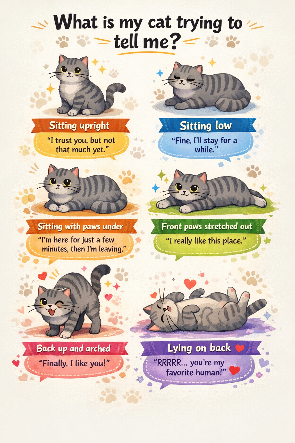 Cats may not speak our language, but their bodies tell a detailed story. From the flick of a tail to the curve of their back, posture reveals mood, comfort level, and even health. Learning to “read” your cat’s body language helps you understand their emotions and strengthen your bond.Here’s what common cat postures really mean:🐈 1. The Relaxed Loaf (Paws Tucked Under)When your cat sits with paws tucked neatly under their body like a loaf of bread:What it means:Feeling safe and comfortableCalm but alertResting without fully sleepingThis posture shows trust in their environment. They’re relaxed but ready to move if needed.😼 2. Belly-Up ExposureWhen your cat rolls over and shows their belly:What it means:Deep trustFeeling secureRelaxed in your presence⚠️ Important: This doesn’t always mean “pet my belly!” For many cats, it’s a sign of comfort—not necessarily an invitation for touch.🐅 3. Arched Back with Fur PuffedThe classic Halloween-cat pose—arched back, raised fur, sideways stance.What it means:Fear or surpriseTrying to look biggerDefensive behaviorYour cat feels threatened and is preparing to protect itself.🐾 4. Tail Straight UpWhen your cat approaches you with their tail held high:What it means:Friendly greetingConfidenceHappiness to see youA slight curl at the tip often means they’re especially pleased.💤 5. Curled Up in a Tight BallWhen your cat sleeps tightly curled:What it means:Conserving warmthSeeking securityDeep restThis position protects vital organs and is instinctual.🧍 6. Sitting Upright with Tail Wrapped AroundA neat, upright sitting pose with tail wrapped around paws:What it means:Calm attentivenessNeutral moodObserving surroundingsThey’re relaxed but aware.😾 7. Low Body, Ears BackWhen your cat lowers their body close to the ground:What it means:Fear or anxietyPreparing to fleeFeeling threatenedGive them space if you see this posture.🐾 8. Slow Blinking While RelaxedAlthough not strictly posture, this body language paired with relaxed positioning is powerful.What it means:TrustAffectionComfortSlow-blinking back can strengthen your bond!🛏️ 9. Stretching Out FullyWhen your cat lies stretched on their side or back:What it means:Complete relaxationFeeling safeComfortable temperatureThis is a great sign that your home feels secure to them.🚨 When Posture Signals Health IssuesCertain postures may indicate discomfort or illness:Hunched back with tense bodyReluctance to moveConstant crouchingStiff walkingIf posture changes suddenly or seems painful, consider consulting a veterinarian.🐾 Final ThoughtsYour cat communicates constantly—just without words. By observing posture, tail position, and overall body tension, you can better understand their feelings and needs.The more you pay attention, the stronger your connection becomes. 💙🐱