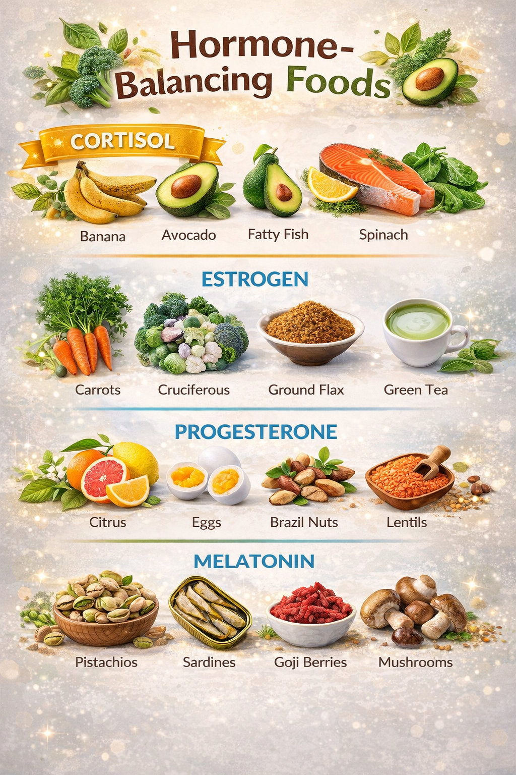 Hormones regulate nearly everything in your body — mood, metabolism, sleep, energy, digestion, reproductive health, and even skin clarity. While no single food can “fix” hormones overnight, the right dietary choices can strongly support balance and reduce symptoms of hormonal fluctuations.Here’s a practical, science-backed guide to hormone balancing foods and how they help your body function optimally.🧠 Why Hormones Get Out of BalanceHormone disruptions can be influenced by:Chronic stressPoor sleepBlood sugar spikesInflammationHighly processed foodsGut imbalancesAging and natural life stagesThe good news? Nutrition plays a powerful role in regulating many of these factors.🥦 1️⃣ Cruciferous Vegetables (Estrogen Support)Examples:BroccoliCauliflowerKaleBrussels sproutsThese vegetables contain compounds like DIM (diindolylmethane) that support healthy estrogen metabolism and liver detoxification.✔ Best for: Estrogen balance, PMS support, menopause support🥑 2️⃣ Healthy Fats (Hormone Building Blocks)Hormones are made from cholesterol and fats — so extremely low-fat diets can disrupt balance.Include:AvocadosOlive oilNuts and seedsFatty fish (salmon, sardines)Chia and flax seeds✔ Best for: Reproductive hormones, cortisol regulation, reducing inflammation🐟 3️⃣ Omega-3 Rich Foods (Inflammation Control)Omega-3 fatty acids reduce inflammation, which directly impacts hormone production.Top sources:SalmonSardinesWalnutsFlaxseeds✔ Best for: PCOS support, mood stability, menstrual health🌾 4️⃣ High-Fiber Foods (Estrogen & Gut Health)Fiber helps remove excess estrogen through digestion.Add:OatsLentilsBeansBerriesWhole grains✔ Best for: Estrogen dominance, bloating, digestive balance🍓 5️⃣ Antioxidant-Rich FruitsBright-colored fruits reduce oxidative stress, which protects hormone-producing glands.Great choices:BlueberriesStrawberriesPomegranateOranges✔ Best for: Thyroid support, adrenal health🥚 6️⃣ Protein for Stable Blood SugarBalanced blood sugar = stable insulin = better hormone balance.Include:EggsChickenGreek yogurtTofuLegumes✔ Best for: Reducing cravings, stabilizing mood swings, preventing insulin spikes🌰 7️⃣ Seed Cycling (Natural Hormone Support)Some people use seed cycling to support menstrual hormone balance:Follicular phase: Flax & pumpkin seedsLuteal phase: Sesame & sunflower seedsThough research is limited, many find it helpful for PMS and cycle regularity.🍵 8️⃣ Adaptogenic Foods & HerbsAdaptogens help regulate stress hormones like cortisol.Examples:AshwagandhaMaca rootHoly basil tea✔ Best for: Stress-related hormonal imbalance❌ Foods That Can Disrupt HormonesLimit:Highly processed foodsExcess sugarTrans fatsExcess alcoholArtificial additivesThese contribute to inflammation, insulin spikes, and cortisol disruption.💤 Don’t Forget Lifestyle!Food is powerful — but hormones also depend on:7–9 hours of sleepStrength trainingStress managementSunlight exposureGut healthNutrition works best alongside healthy habits.⚠️ Important NoteIf you suspect thyroid disorders, PCOS, endometriosis, menopause complications, or adrenal dysfunction, consult a healthcare professional. Diet supports hormones — but medical guidance may be necessary.🌸 Final ThoughtsHormone balancing foods focus on:✔ Whole, nutrient-dense meals✔ Healthy fats✔ Fiber✔ Stable blood sugar✔ Reduced inflammationSmall daily improvements make a big long-term difference. Your hormones respond best to consistency — not extremes.Would you like a hormone-balancing 7-day meal plan next? 🥗💚