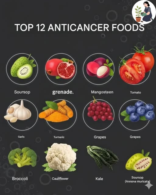 • A selection of the 12 anti-cancer foods (berries, leafy greens, garlic, turmeric, tomatoes, nuts, etc.)