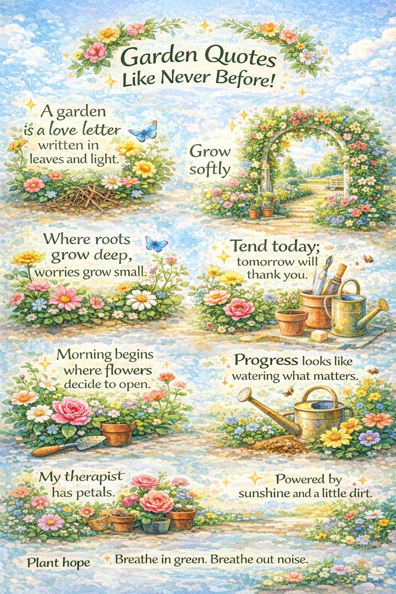 Fresh, inspiring, and made to make you feel the garden—not just see it.Whether you’re decorating a garden sign, writing a caption, journaling, or just need a little green inspiration, these garden quotes like never before are modern, soulful, and deeply connected to nature.🌱 Short Garden Quotes (Perfect for Signs & Captions)“Where flowers bloom, hope grows.”“A garden is quiet happiness.”“Plant dreams. Grow peace.”“Let your soul take root.”“Bloom slowly. Nature never rushes.”“Every flower is a small miracle.”🌸 Deep & Poetic Garden Quotes“A garden teaches patience better than any book.”“In the garden, time slows and life speaks softly.”“You don’t find yourself—you grow yourself, like a garden.”“The earth laughs in flowers, and we learn to listen.”“Gardens are love made visible.”These are the kind of garden quotes like never before that stay with you.🌼 Inspirational Garden Quotes (Life & Growth)“What you water, grows.”“Even the smallest seed believes in tomorrow.”“Growth happens quietly, then all at once.”“Storms don’t stop gardens—they shape them.”“Bloom where you are planted, but don’t be afraid to replant.”Perfect for motivation, wellness spaces, or daily reminders.🌿 Cozy & Soulful Garden Quotes“The garden is my therapy.”“Some days need dirt, sun, and silence.”“Happiness smells like fresh soil and flowers.”“My heart feels at home among the plants.”These quotes feel like a warm cup of tea—slow, grounding, and real.🌻 Modern & Aesthetic Garden Quotes“Soft hands. Strong roots.”“Earth tones heal.”“Wild, but growing.”“Let it be messy. Let it be alive.”“Rooted, not rushed.”Ideal for Pinterest, Instagram, journals, and wall art.🌷 Garden Quotes About Flowers“Flowers don’t compete—they bloom.”“Every flower blooms in its own time.”“Petals teach gentleness. Roots teach strength.”“A flower never apologizes for being beautiful.”🌾 Garden Quotes for Mindfulness & Peace“The garden teaches you to breathe again.”“Stillness grows here.”“Touch the earth. Calm the mind.”“Nature doesn’t hurry, yet everything is done.”🌺 Why Garden Quotes MatterGarden quotes remind us to:Slow downBe patientTrust growthAppreciate small beautyThat’s why garden quotes like never before feel so powerful—they reflect life itself.🌿 Final ThoughtA garden isn’t just a place—it’s a mindset. These quotes are little seeds of wisdom you can carry anywhere. Save them, share them, or let them inspire your next planting day.