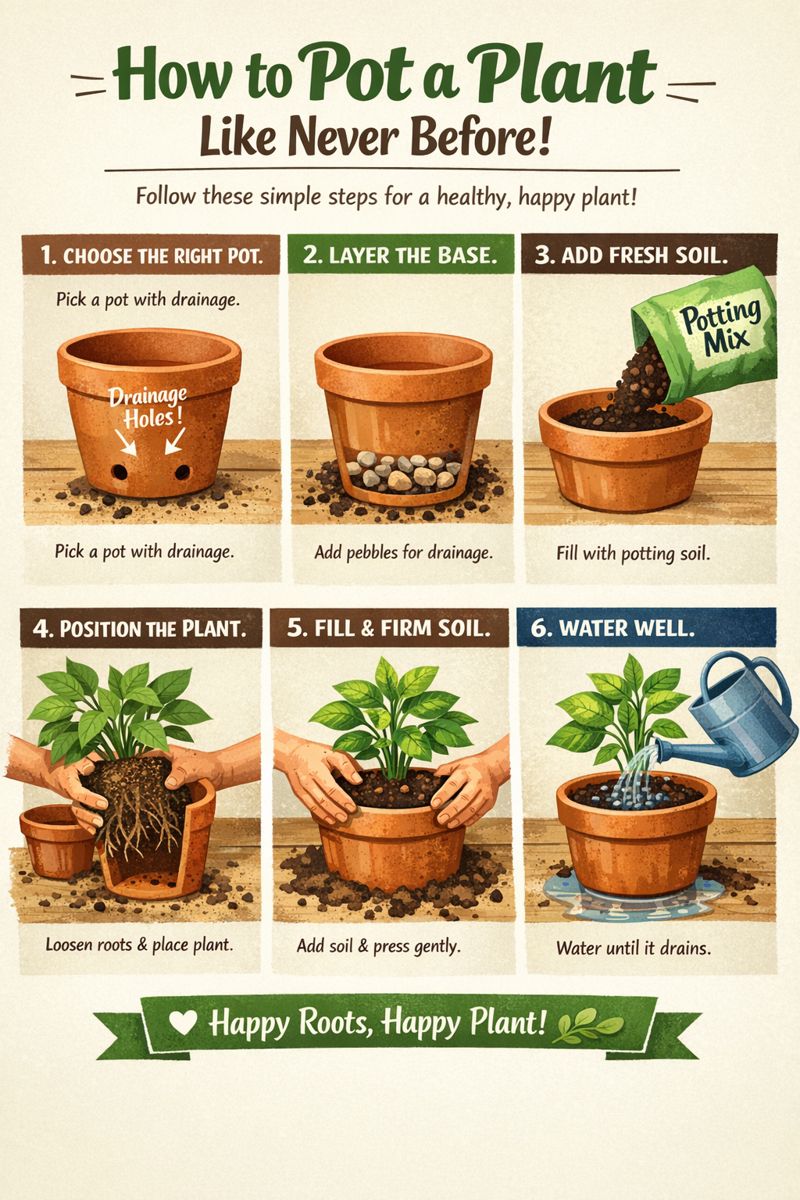 Potting a plant may seem simple, but doing it the right way can completely transform how your plants grow, look, and thrive. Whether you’re a beginner plant parent or an experienced gardener, learning how to pot a plant like never before means healthier roots, stronger growth, and longer-lasting plants.Across the United States, United Kingdom, and Canada, indoor and outdoor plant lovers are discovering that potting isn’t just about soil and containers—it’s a skill. This guide will walk you through modern, expert-backed techniques that go far beyond the basics and help your plants flourish from day one 🌿.Why Proper Potting Really MattersPotting is more than placing a plant in soil. Done incorrectly, it can lead to:Root rotStunted growthYellowing leavesPoor drainageWhen you master how to pot a plant like never before, you create the perfect environment for roots to breathe, absorb nutrients, and grow strong.Step 1: Choose the Perfect PotSize Matters More Than You ThinkThe pot should be 1–2 inches wider than the root ballToo small = root-bound plantToo large = excess moisture and rotDrainage Is Non-NegotiableAlways choose a pot with drainage holes. If the pot doesn’t have holes:Use it as a decorative cover potOr drill holes if possibleThis single step is one of the biggest secrets to potting success.Step 2: Select the Right Potting MixNever Use Garden SoilGarden soil is too heavy and compact for containers. Instead, use:Indoor potting mix for houseplantsSucculent/cactus mix for drought-tolerant plantsMoisture-retaining mix for ferns and tropicalsBoost Your Soil (Pro Tip)Mix in:Perlite for airflowCoco coir for moisture balanceCompost for nutrientsThis upgrade alone is part of how to pot a plant like never before.Step 3: Prepare the Plant ProperlyGently Loosen the RootsBefore potting:Remove the plant from its nursery containerGently massage the root ballUntangle circling rootsThis encourages roots to grow outward instead of staying trapped.Step 4: Create the Perfect Base LayerSkip the Myth: No Rocks at the BottomContrary to popular belief, rocks do not improve drainage. They actually trap water.Instead:Place a thin layer of soil at the bottomUse mesh or coffee filter over drainage holes to keep soil inThis modern technique is key to potting like a pro.Step 5: Position the Plant CorrectlyPlace the plant so the root crown sits just below the pot rimAvoid planting too deep—it can suffocate the stemCenter the plant for balance and visual appealCorrect positioning is a subtle but powerful trick.Step 6: Fill, Firm, and BreatheFill with CareAdd soil gradually around the rootsGently press—not compact—the soilLeave space at the top for wateringAir pockets are good; tightly packed soil is not.Step 7: Water the Smart WayFirst Watering Is CrucialWater thoroughly until it drains from the bottomThis settles the soil and removes air gapsPause FertilizingWait 2–4 weeks before fertilizing. Fresh soil already contains nutrients, and overfeeding can shock the plant.How to Pot a Plant Like Never Before: Advanced TipsTip 1: Match Pot Material to Plant TypeTerracotta: Breathable, great for succulentsPlastic: Retains moisture, good for tropical plantsCeramic: Stylish but heavier—ensure drainageTip 2: Consider Root Growth DirectionSome plants prefer tight roots (snake plants), while others love space (monstera). Pot accordingly.Tip 3: Label the PlantAdd a label with:Plant namePotting dateWatering needsThis is especially useful for growing collections.Common Potting Mistakes to AvoidUsing oversized potsSkipping drainage holesCompacting soil too tightlyWatering too frequently after pottingRepotting during dormancy (especially winter)Avoiding these mistakes instantly improves plant health.Indoor vs Outdoor Potting DifferencesIndoor PlantsFocus on drainage and airflowUse lighter soil mixesAvoid overwateringOutdoor PlantsChoose weather-resistant potsEnsure proper weight for stabilityUse soil suited to climateUnderstanding this distinction is essential to potting success.When Should You Repot a Plant?Signs it’s time:Roots growing out of drainage holesWater runs straight throughSlow or stunted growthSoil dries out too fastRepotting at the right time is part of how to pot a plant like never before.Why These Techniques WorkEncourages healthy root systemsPrevents disease and rotImproves nutrient absorptionPromotes faster, stronger growthThese aren’t just tips—they’re game changers.Conclusion: How to Pot a Plant Like Never BeforePotting a plant correctly can completely change how it grows and how long it lives. By choosing the right pot, improving soil quality, respecting root structure, and watering wisely, you move from basic planting to expert-level care.Whether you’re potting plants in the United States, the United Kingdom, or Canada, these modern techniques will help your plants thrive like never before. Start using these methods today, and you’ll quickly see stronger roots, healthier leaves, and happier plants 🌱✨.