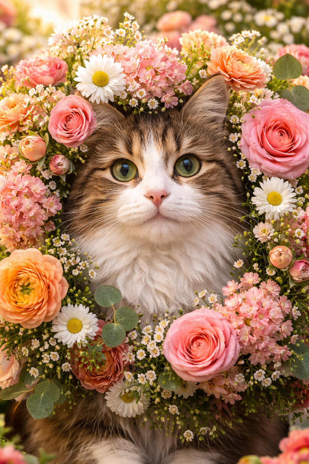 Creating a cat with flowers—as an illustration, craft, or photo setup—is a charming idea that works for art projects, gifts, décor, or social media. Below is a clear, beginner-friendly step-by-step guide focused on drawing/illustrating a cat with flowers, with tips you can adapt for painting, digital art, or mixed media.Step 1: Choose Your Style and MoodBefore you start, decide the look you want:Cute & cartoon (round shapes, big eyes)Realistic (detailed fur, soft shading)Minimalist (simple lines, pastel flowers)Whimsical (floral crowns, fantasy colors)This choice guides your shapes, colors, and level of detail.Step 2: Sketch the Basic Cat ShapeStart light—use a pencil or low-opacity brush.Draw a circle or oval for the headAdd a small oval below for the body (or just the head for a portrait)Sketch two triangles for earsAdd a curved line for the neck and shoulders👉 Keep lines loose—you’ll refine them later.Step 3: Add Facial FeaturesBring your cat to life:Draw almond-shaped eyes (or big circles for a cute look)Add a small triangle noseDraw a soft “W” shape for the mouthPlace whisker dots and light whiskers💡 Tip: Cats look gentler when eyes sit lower on the face.Step 4: Refine the Cat’s OutlineNow clean up:Smooth the head and ear shapesAdd subtle fur edges (small zigzags or short strokes)Define the body posture (sitting, peeking, or lying down)Erase or hide rough sketch lines.Step 5: Plan the Flower PlacementDecide how flowers interact with the cat:🌼 Flower crown on the head🌸 Flowers around the neck like a garland🌷 Cat sitting among flowers🌹 One flower held in the mouth or pawLightly sketch circles where flowers will go.Step 6: Draw the FlowersChoose simple flowers if you’re a beginner:Daisies: circle + petalsRoses: spiral center + layered petalsTulips: cup shape with 2–3 petalsWildflowers: small clustersAdd leaves and stems for balance.Step 7: Add Details and TextureThis is where your artwork shines:Add fur lines around cheeks and earsLayer petals for depthSlight overlaps between flowers and fur make it naturalDon’t overdo it—suggestion works better than perfection.Step 8: Color Your Cat and FlowersChoose a soft, harmonious palette.Popular Color Combos:Gray or cream cat + pink flowersOrange cat + white & yellow flowersBlack cat + pastel floralsColoring Tips:Shade lightly under the chin and earsUse darker tones at flower centersAdd highlights to eyes and petalsWorks for colored pencils, watercolors, acrylics, or digital tools.Step 9: Add Background (Optional)Keep it simple:Soft pastel washMinimal dots or sparklesLight greeneryPlain background for stickers or printsA clean background keeps focus on the cat and flowers.Step 10: Final TouchesOutline lightly (or not at all for a soft look)Add tiny highlights to eyes and petalsSign your artwork 🎨Step back and admire your cat with flowers creation!Extra Tips for Best ResultsUse reference photos of cats and flowersPractice flowers separately firstLess detail = cuter resultSoft colors feel more romantic and calmDigital artists: use layers for sketch, line, and colorCreative Uses for “Cat with Flowers”Wall art or printsGreeting cardsStickers or plannersPhone wallpapersGifts for cat loversFinal ThoughtsCreating a cat with flowers is a joyful, relaxing project that blends nature and personality. Whether you’re a beginner or experienced artist, following these steps helps you build confidence and creativity—one petal and whisker at a time 🌸🐾