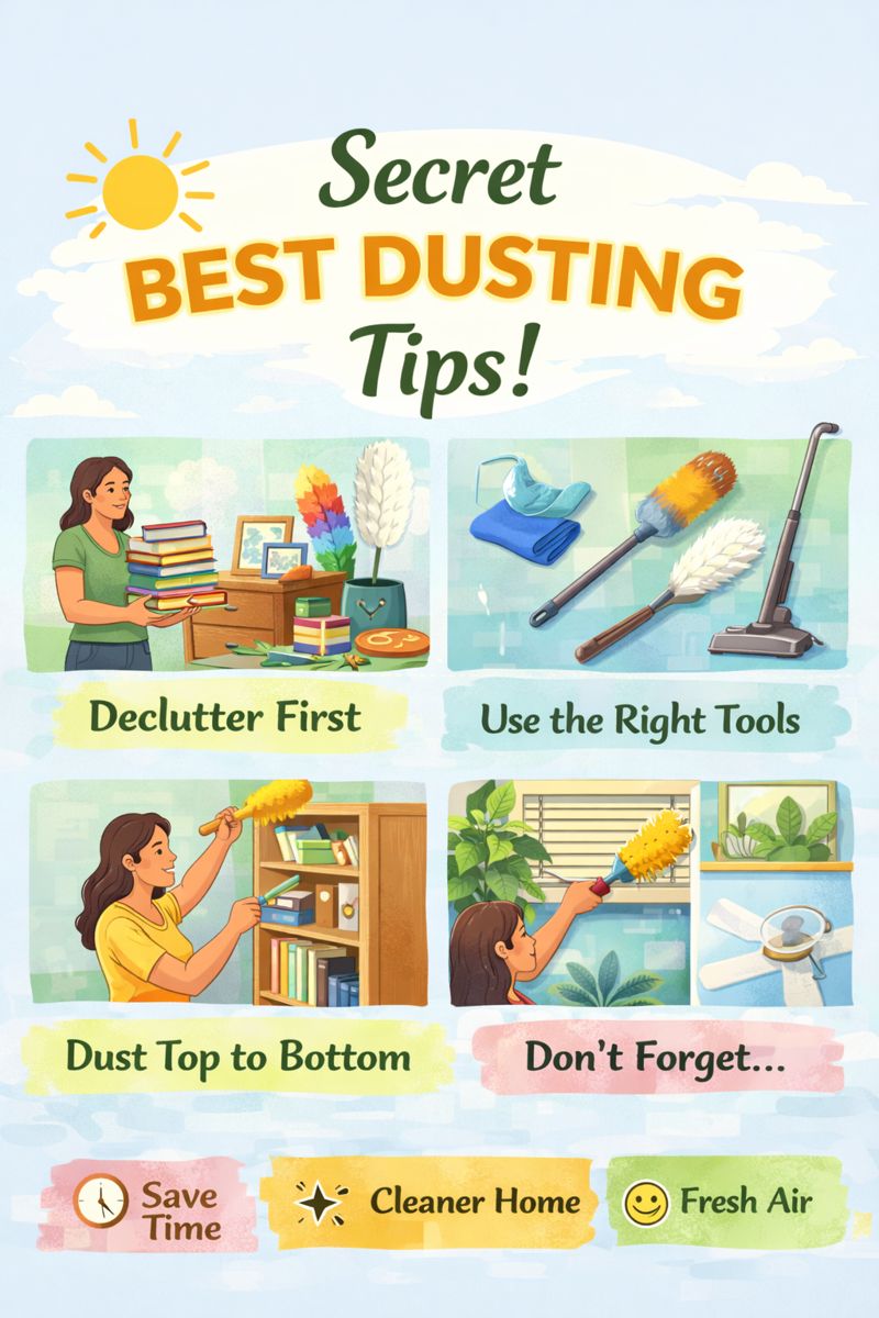 Dusting seems simple—until you realize how quickly dust comes back, how it triggers allergies, and how it makes even a clean home feel untidy. The truth is, most people dust the wrong way. They spread dust around instead of removing it, or they miss the real dust magnets entirely.In this guide, you’ll uncover the secret best dusting tips that professional cleaners use to keep homes cleaner for longer. These practical, easy-to-follow strategies work beautifully for households across the United States, United Kingdom, and Canada—no fancy tools required.Why Dust Keeps Coming Back So FastUnderstanding dust helps you fight it effectively.What Dust Is Made OfDead skin cellsFabric fibersPet danderPollen and outdoor particlesDirt tracked in from shoesBecause dust is constantly forming, the goal isn’t perfection—it’s smart control.The Biggest Dusting Mistake Almost Everyone MakesDry Dusting with the Wrong ToolsUsing dry cloths, paper towels, or feather dusters often pushes dust into the air, where it settles again minutes later.👉 The secret best dusting tips start with capturing dust, not spreading it.Secret Best Dusting Tips That Actually Work1. Always Dust from Top to BottomThis is a professional cleaning rule.Start with ceiling fans and shelvesMove to furniture and surfacesFinish with baseboards and floorsDust falls downward—work with gravity, not against it.2. Use Slightly Damp Microfiber ClothsMicrofiber traps dust instead of pushing it around.Why it works:Creates static that attracts dustHolds particles tightlyReduces airborne dustLightly dampen the cloth—never soak it.3. Skip Feather Dusters (Yes, Really)Feather dusters look traditional but mostly redistribute dust.Better alternatives:Microfiber clothsMicrofiber dusting wandsVacuum attachments with soft brushesThis single switch is one of the most effective secret best dusting tips.Hidden Places Where Dust Loves to HideDust collects in places most people forget.Commonly Missed Dust HotspotsCeiling fan bladesDoor frames and window sillsLampshadesPicture framesBehind TVs and electronicsAir vents and return grillesTargeting these areas makes your whole home feel cleaner.The Best Dusting Tools (Simple but Powerful)You don’t need expensive gadgets.Must-Have Dusting ToolsMicrofiber cloths (washable and reusable)Vacuum with HEPA filterSoft brush vacuum attachmentsExtendable microfiber dusterQuality tools = better results with less effort.How Often Should You Dust?Dusting frequency depends on your home.General GuidelinesOnce a week for most homesTwice a week if you have petsMore often during allergy seasonsConsistency is one of the most overlooked secret best dusting tips.Dusting Tips for Allergy SufferersIf dust triggers sneezing or asthma, technique matters even more.Allergy-Friendly Dusting SecretsWear a mask while dustingUse damp cloths onlyVacuum with a HEPA filterOpen windows briefly after cleaningThese steps reduce airborne allergens dramatically.The Right Way to Dust FurnitureWood FurnitureUse a slightly damp microfiber clothAvoid heavy sprays (they attract dust later)Buff with a dry cloth afterwardGlass & ScreensUse microfiber onlyAvoid ammonia-based cleaners on screensDust before wiping with cleanerGentle methods protect surfaces and reduce buildup.Dusting Electronics Without DamageElectronics attract dust like magnets.Safe Dusting TipsTurn devices off and unplugUse dry microfiber or soft brush attachmentsAvoid sprays directly on devicesThis keeps electronics clean and functioning properly.Secret Tip: Reduce Dust Before It FormsThe best dusting tip? Prevent dust buildup in the first place.Dust-Reducing HabitsRemove shoes at the doorWash bedding weeklyGroom pets regularlyReplace HVAC filters every 1–3 monthsUse doormats inside and outsideLess dust entering your home means less cleaning later.The Best Time of Day to DustTiming matters more than you think.Pro TipDust before vacuuming, and ideally when:Windows are closedAir is stillFans are offThis prevents dust from resettling too quickly.Natural Dusting Solutions (Optional)You don’t need chemical sprays.Simple DIY Dusting Spray1 cup water1 teaspoon vinegar1 teaspoon olive oilUse lightly on a cloth, not directly on surfaces.This adds shine while capturing dust naturally.Quick Dusting Routine (15 Minutes)Short on time? Try this.Ceiling fans & shelves (5 min)Main furniture surfaces (5 min)Electronics & baseboards (5 min)Fast routines keep dust under control without overwhelm.Common Dusting Myths—Busted❌ “Daily dusting is necessary” → Smart weekly dusting works❌ “More spray = cleaner” → It attracts dust❌ “All cloths work the same” → Microfiber winsUnderstanding these myths unlocks the secret best dusting tips.Why Smart Dusting Makes Your Home Feel BetterA dust-free home isn’t just about looks.Better air qualityFewer allergy symptomsCleaner surfaces longerLess overall cleaning stressDusting the right way saves time and energy.ConclusionDusting doesn’t have to be frustrating or endless. With the right tools, order, and habits, you can dramatically reduce dust and keep your home looking fresh longer.By applying these secret best dusting tips, you’ll stop spreading dust and start eliminating it—creating a healthier, cleaner, and more comfortable space every day. Once you dust smarter, you’ll never go back to old methods again. ✨🏡