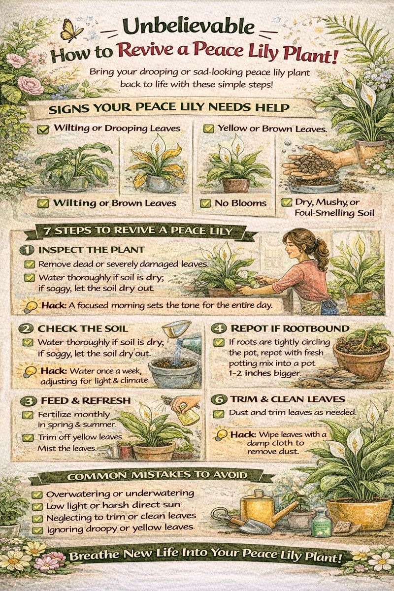 Peace lilies are loved for their elegant white blooms and lush green leaves—but they’re also famous for being dramatic. One day they look stunning, the next they’re completely wilted. The good news? In most cases, a dying peace lily isn’t dead at all. With the right care, it’s truly unbelievable how to revive a peace lily plant!In this detailed, SEO-optimized guide, you’ll learn exactly why peace lilies struggle, how to identify the problem, and step-by-step solutions to restore your plant to health. These tips are suitable for plant lovers in the United States, United Kingdom, and Canada.Why Peace Lily Plants Decline So QuicklyPeace lilies are sensitive, but they’re also very forgiving once you understand their needs.Common Reasons a Peace Lily Looks DyingUnderwatering or overwateringPoor drainageToo much or too little lightNutrient deficienciesTemperature stressRoot-bound or compacted soilUnderstanding the cause is the first step in unbelievable how to revive a peace lily plant!Signs Your Peace Lily Needs RevivingYour plant will clearly show when something is wrong.Warning SignsDrooping or collapsed leavesYellow or brown leaf tipsNo flowers for long periodsMushy stems or foul-smelling soilDry, crispy leavesDon’t panic—most of these issues are reversible.Step 1: Check the Soil Moisture ImmediatelyWatering issues are the #1 cause of peace lily problems.H3: If the Plant Is UnderwateredSoil feels dry and lightLeaves are limp but not yellowFix:Water thoroughly until water drains from the bottomPlace the pot in a sink for 20–30 minutes to rehydrateYou’ll often see leaves perk up within hours—this is why it’s unbelievable how to revive a peace lily plant!H3: If the Plant Is OverwateredYellowing leavesMushy stemsWet, smelly soilFix:Stop watering immediatelyRemove the plant from the potTrim black or mushy rootsRepot in fresh, well-draining soilStep 2: Improve DrainagePeace lilies love moisture—but hate sitting in water.Drainage HacksAlways use pots with drainage holesEmpty saucers after wateringAdd perlite or orchid bark to soil for airflowGood drainage alone can dramatically revive your plant.Step 3: Adjust Light ConditionsLight plays a huge role in recovery.H3: Ideal Light for Peace LiliesBright, indirect lightAvoid direct sunlight (causes leaf burn)Too little light = no flowers and weak growthMove your plant near a window with filtered light to speed up recovery.Step 4: Trim Damaged LeavesPruning helps redirect energy to healthy growth.H3: How to Prune ProperlyUse clean, sharp scissorsRemove yellow, brown, or fully wilted leavesCut at the base of the stemThis step is essential in unbelievable how to revive a peace lily plant!Step 5: Check the Roots (Root-Bound Plants)A root-bound peace lily can’t absorb water properly.Signs of Root BindingRoots circling the potWater runs straight through soilSlow growthFix:Repot into a container 1–2 inches largerUse fresh, airy potting mixGently loosen roots before plantingStep 6: Feed Your Peace Lily (But Gently)Nutrient deficiency can cause weak growth and yellow leaves.H3: Fertilizing TipsUse balanced houseplant fertilizerFeed once every 6–8 weeks during spring and summerAvoid fertilizing stressed plants until recovery beginsLess is more when reviving a peace lily.Step 7: Improve HumidityPeace lilies are tropical plants.Humidity HacksMist leaves lightly (not excessively)Place a tray of water and pebbles nearbyUse a humidifier in dry roomsHigher humidity speeds up recovery and encourages blooms.Step 8: Check Temperature and LocationPeace lilies dislike extremes.Ideal ConditionsTemperature: 65–80°F (18–27°C)Keep away from heaters, AC vents, and cold draftsStable conditions help the plant recover faster.How Long Does It Take to Revive a Peace Lily?Recovery TimelineUnderwatering: Hours to 1 dayOverwatering/root issues: 1–3 weeksSevere neglect: Several weeks with consistent carePatience is key—but results can be dramatic.Prevent Future Problems (Peace Lily Care Tips)Once revived, keep it healthy with simple habits.Ongoing Care TipsWater when top inch of soil is dryUse filtered or distilled water (peace lilies are sensitive to chemicals)Rotate the plant for even growthClean leaves regularly to improve photosynthesisPrevention is the secret behind unbelievable how to revive a peace lily plant!—and keep it thriving.Common Mistakes to AvoidAvoid These ErrorsWatering on a strict schedule instead of checking soilLetting the plant sit in standing waterUsing direct sunlightOver-fertilizingGentle, consistent care always wins.Conclusion: Unbelievable How to Revive a Peace Lily Plant!Peace lilies may look fragile, but they’re incredibly resilient. With proper watering, drainage, light, and patience, it’s truly unbelievable how to revive a peace lily plant! Many plants that appear “dead” can bounce back beautifully—often within days.If your peace lily is drooping or struggling, don’t give up. Follow these steps, and you’ll likely be rewarded with lush green leaves and elegant white blooms once again. 🌿🤍✨
