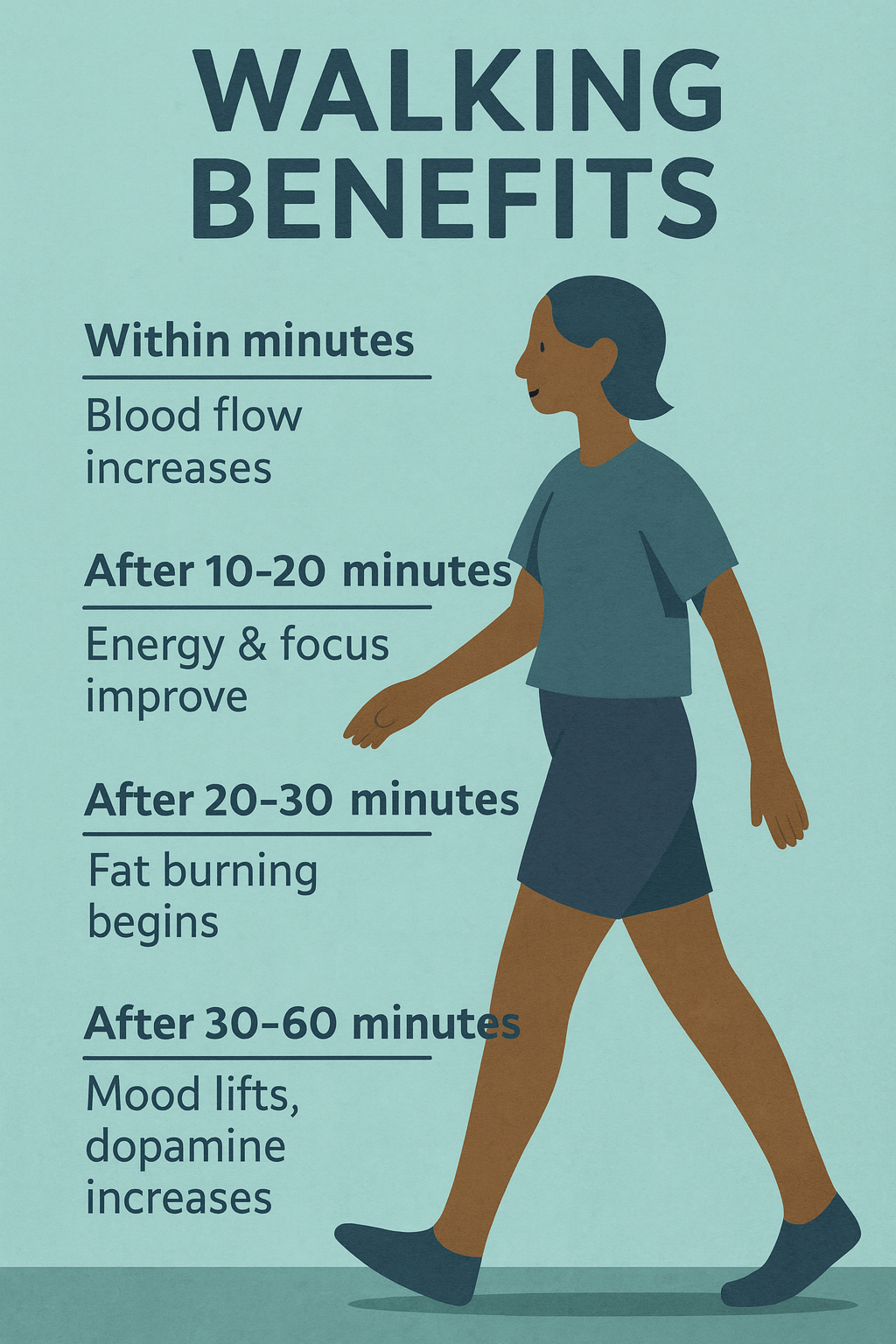 Walking might seem simple, but it’s one of the most powerful habits you can add to your daily routine. You don’t need a gym membership, expensive equipment, or perfect athletic skills. Just comfortable shoes, a safe route, and a little time. Whether you’re walking around your neighborhood, strolling through a park, or heading to school on foot, 30 to 60 minutes a day can make a huge difference in your physical health, mental wellbeing, and overall energy.Here’s how this small habit creates big change.🌟 1. Walking Boosts Your Mood (More Than You Think)Walking is a natural mood-lifter. Even a 10–15 minute walk can:Release feel-good endorphinsReduce stressClear your mindImprove focus and motivationStudents especially benefit—walking before homework or studying helps your brain reset. Over time, daily walking becomes a mini break your body and mind start craving.💪 2. It Strengthens Your Body Without Being Hard on Your JointsNot everyone enjoys running or intense workouts, and that’s totally okay! Walking is easy on your knees and ankles while still helping your body:Build leg and core strengthImprove postureSupport bone healthIncrease flexibilityWith 30–60 minutes a day, you’ll feel stronger and more energized without feeling worn out.❤️ 3. It’s Amazing for Your HeartWalking regularly supports heart health at any age. Even though you’re still young, building strong habits makes a big difference later on. Walking helps:Improve circulationSupport healthy blood pressureStrengthen your cardiovascular systemThe best part? You don’t even have to walk fast. A comfortable, consistent pace is enough.🔋 4. You Get More Energy Throughout the DayIt sounds backwards, but moving your body actually creates more energy—not less. A daily walk:Wakes up your musclesImproves oxygen flowBoosts alertnessHelps fight tiredness and sluggishnessMany teens find they feel less drained, especially in the mornings or after school.😌 5. It Reduces Stress and Helps You Sleep BetterIf your mind feels overloaded, a walk can help. Being outside, listening to music or nature sounds, and getting fresh air:Lowers stressCalms anxious thoughtsHelps release tensionMakes falling asleep easierIf you walk in the late afternoon or early evening, your body’s natural sleep rhythms become more balanced.🧠 6. Walking Helps You Think More ClearlyTeachers, scientists, and psychologists all agree—walking boosts brain function. It helps with:CreativityProblem-solvingFocusMemoryIf you’re stuck on homework, taking a quick walk often helps you return with fresh ideas.🤝 7. It’s a Social Activity (If You Want It to Be!)Walking alone can be peaceful, but walking with someone else can be fun. You can walk:With a friendWith a siblingWith a family memberWith your dogIn a walking club or school groupYou get movement and quality time.🌿 8. You Connect With NatureEven short walks outside help you feel more grounded. Fresh air, sunlight, and nature sounds all help your brain relax and recharge. This is especially important if you spend a lot of time indoors, on screens, or at school.🧭 9. It Builds Discipline and Routine (Without Feeling Like a Chore)Walking 30 to 60 minutes a day builds consistency in a gentle, stress-free way. It helps you learn to:Stick to small goalsCreate healthier habitsShow up for yourself dailyThis kind of gentle discipline spreads into other areas of your life—school, hobbies, friendships, and personal projects.🔄 How to Make Walking a Daily HabitHere are easy ways to fit walking into your routine:Walk for 15–20 minutes before or after schoolTake a walk during study breaksWalk with music or a podcastBreak it into shorter walks (10–15 minutes each)Walk a lap around your block after mealsUse walking as your “me time”Small steps lead to big change.🎧 Make Your Walk More EnjoyableTry adding:Your favorite playlistA podcastA relaxing audiobookA friend or family memberA scenic route (park, riverside, neighborhood trail)Walking doesn’t have to be boring—it can be something you look forward to.🏆 Conclusion: A Simple Habit With Life-Changing BenefitsWalking 30 to 60 minutes a day truly can transform your life. It strengthens your body, clears your mind, boosts your mood, and builds healthier habits in a gentle, enjoyable way. Whether you walk alone, with music, or with someone you love, this simple daily routine has the power to make every part of your life feel a little brighter and easier.